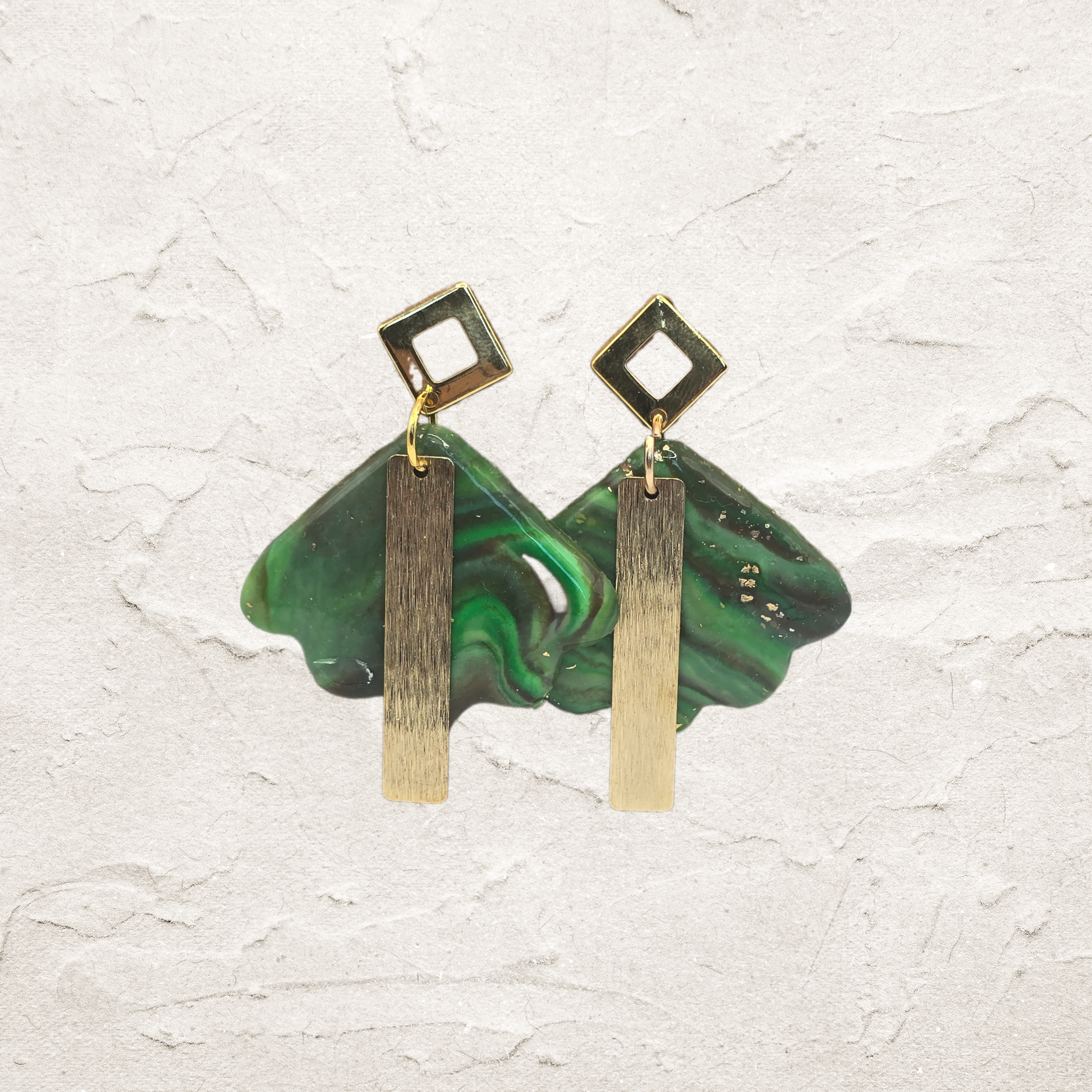 Sculptural and sophisticated, our Verdant Elegance Drop Earrings are a celebration of nature and modern design. These earrings feature a deep emerald green resin base with mesmerizing marbling, accented by brushed gold-tone bars that add a touch of sleek contrast. Topped with geometric diamond-shaped studs, this pair effortlessly blends organic flow with architectural edge.